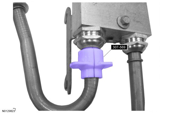 10. Using 307-569, disconnect the transmission return and inlet cooler tubes from the transmission fluid thermal bypass valve.