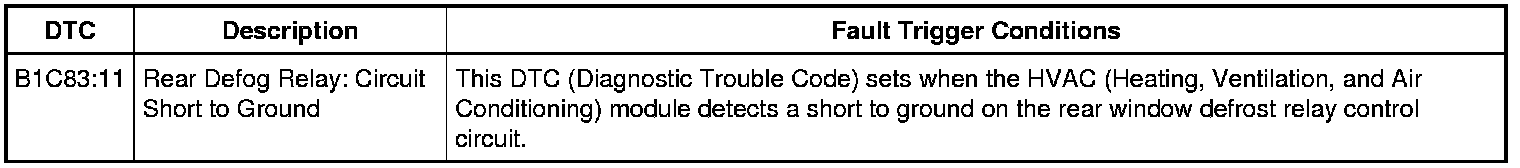 The HVAC (Heating, Ventilation, and Air Conditioning) module deactivates the rear window defrost relay whenever the ignition is turned OFF, the rear window defrost switch is pressed (while the defrost system is active) or after a 15 minute timer has elapsed. REFER to Rear Window Defrost Description and Operation.