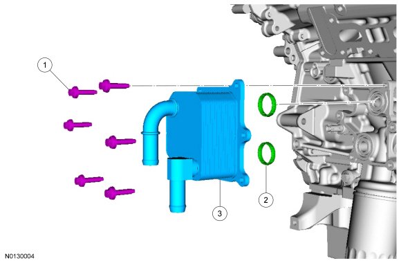6. Discard the oil cooler gasket and inspect the oil cooler. Clean and inspect all sealing surfaces.