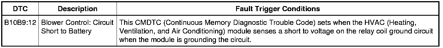 When the blower motor relay coil receives a ground from the HVAC (Heating, Ventilation, and Air Conditioning) module, the relay coil is energized and voltage is delivered to the blower motor and the blower motor speed control from the relay. Ground for the motor is provided from the blower motor speed control. Ground is provided for the blower control module. The HVAC (Heating, Ventilation, and Air Conditioning) module sends a PWM (Pulse Width Modulated) signal to the blower motor speed control to control the blower speed.