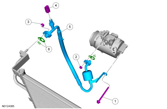 4. Using a new O-ring seal, connect the A/C (Air Conditioning) compressor discharge fitting and install the nut.