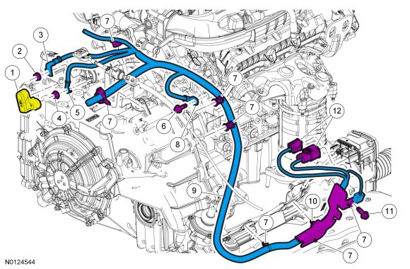 20. Disconnect the electrical connector and the wire harness retainer from the A/C (Air Conditioning) compressor.