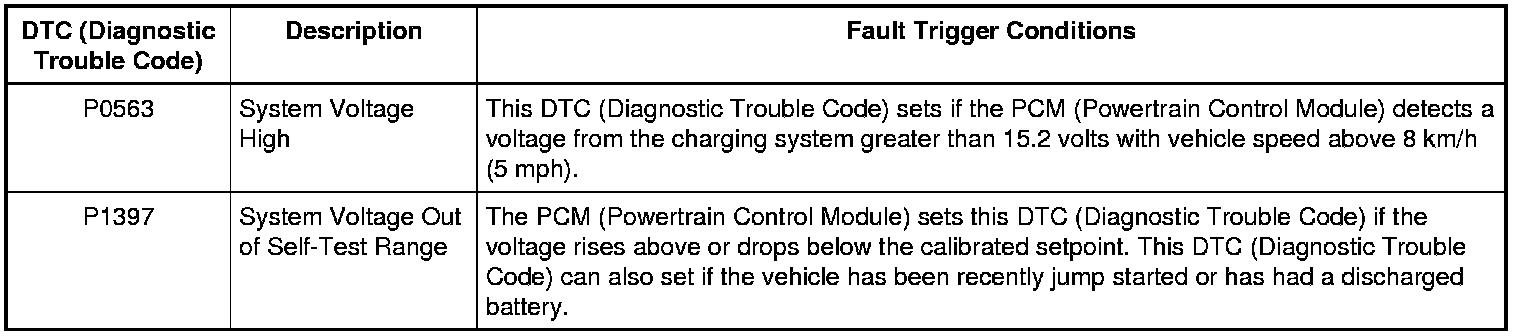 NOTE: DTC (Diagnostic Trouble Code) P0563 or P1397 can be set if the vehicle has been recently jump started, the battery has been recently charged or the battery has been discharged. The battery may become discharged due to excessive load(s) on the charging system from aftermarket accessories or if vehicle accessories have been operating for an extended period of time without the engine running.