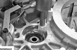 3. Using a wrench, turn the nut on 204-069 (T81P-1104-C) to remove the transfer shaft bearing cup from the transaxle case.