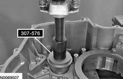 4. Using 307-576, press the transfer shaft bearing cup in the transaxle case.
