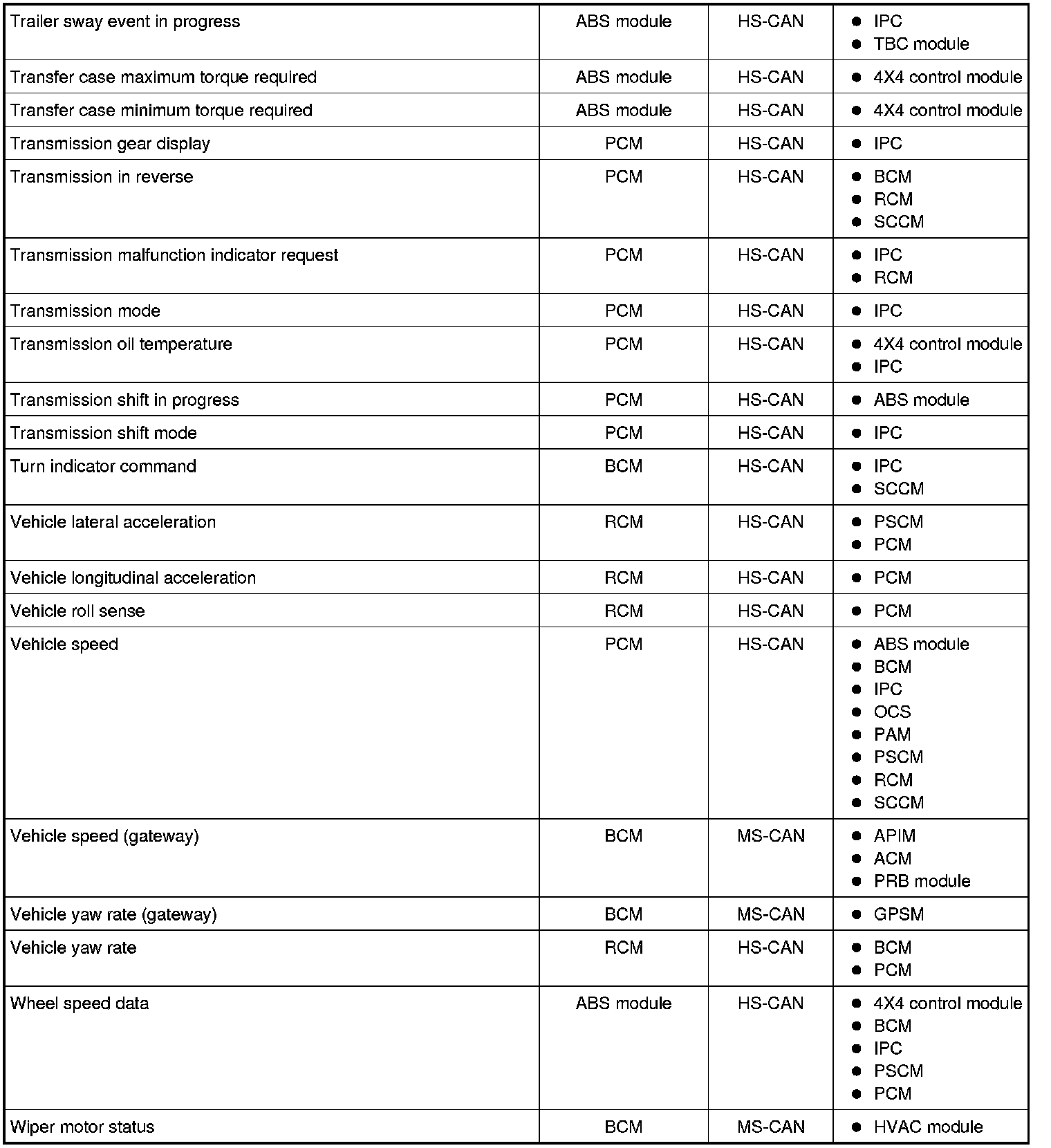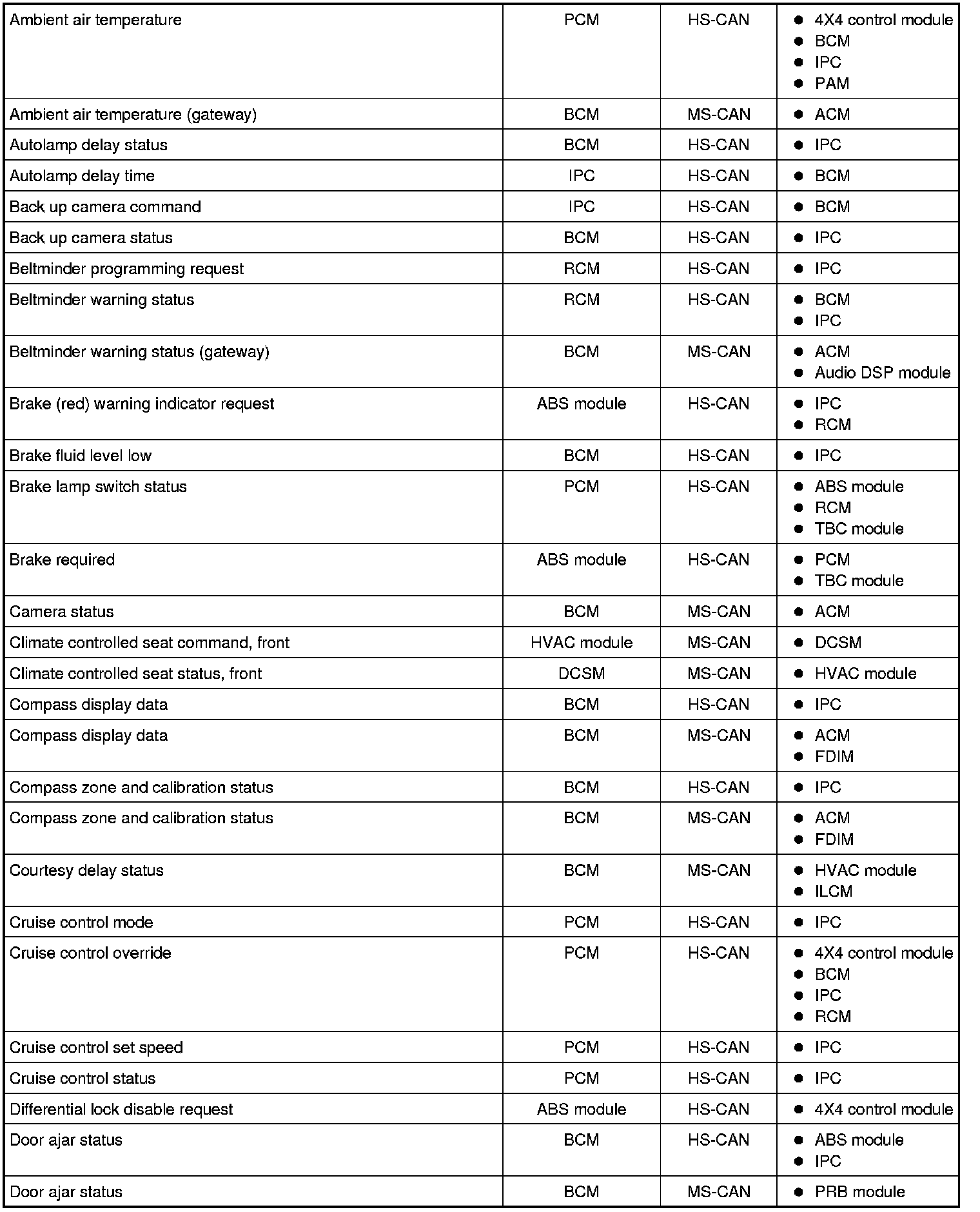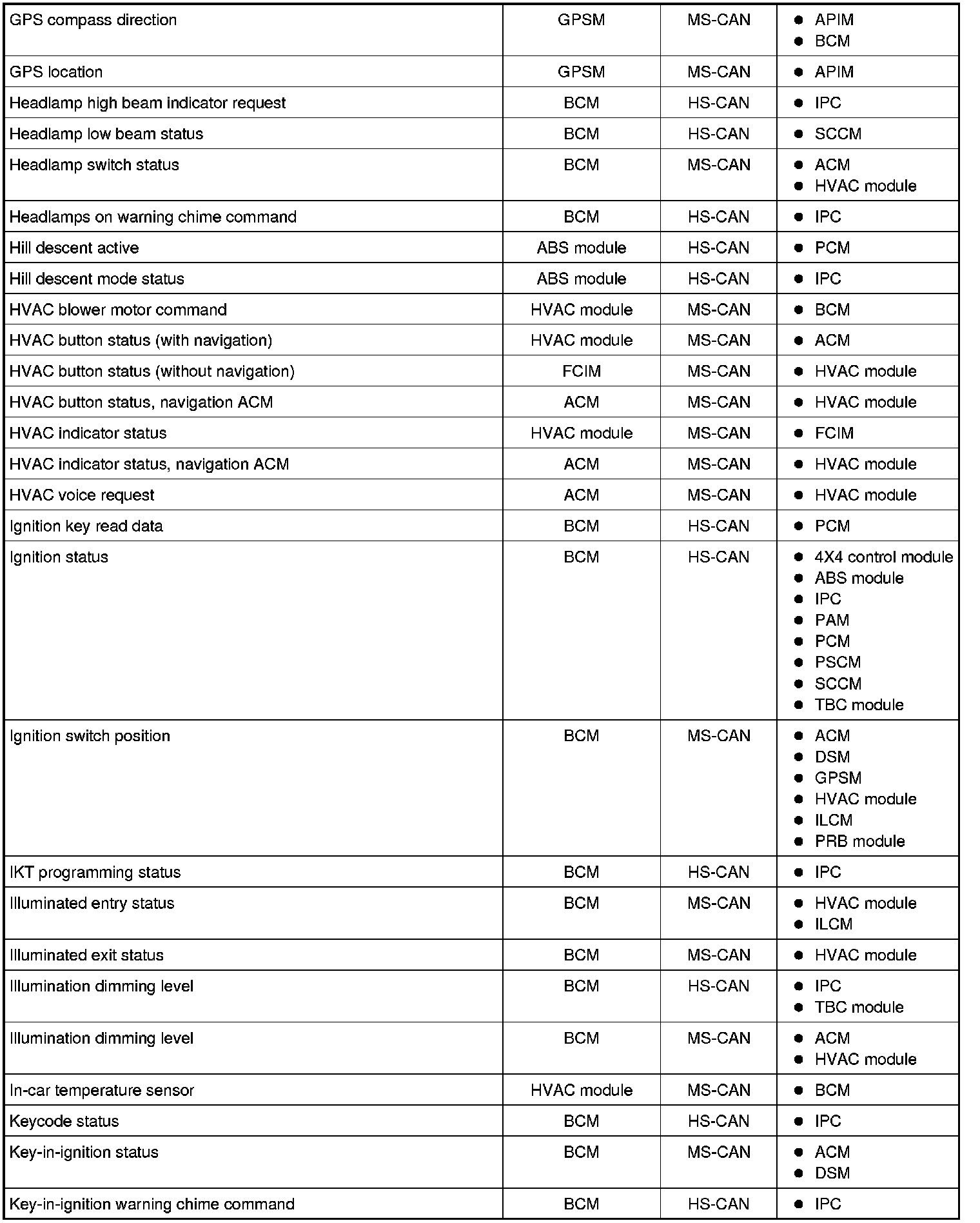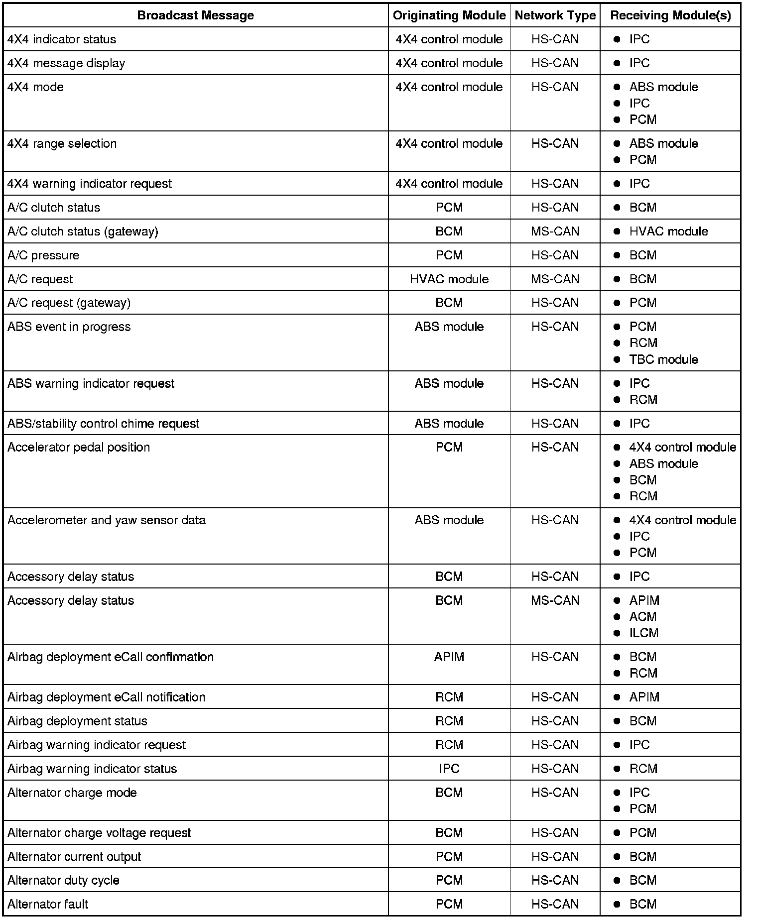 NOTE: This chart describes the specific HS-CAN and MS-CAN messages broadcast by each module, and the module(s) that receive the message.