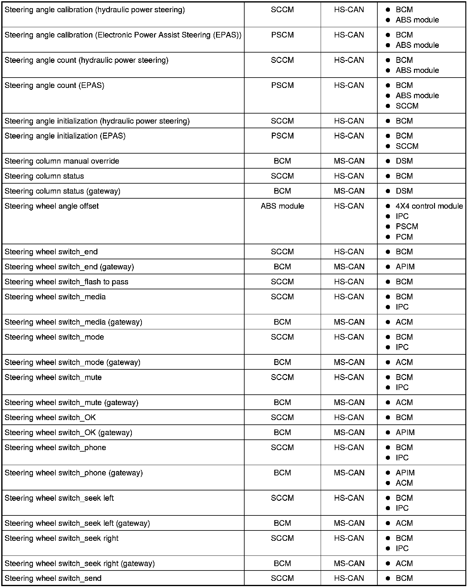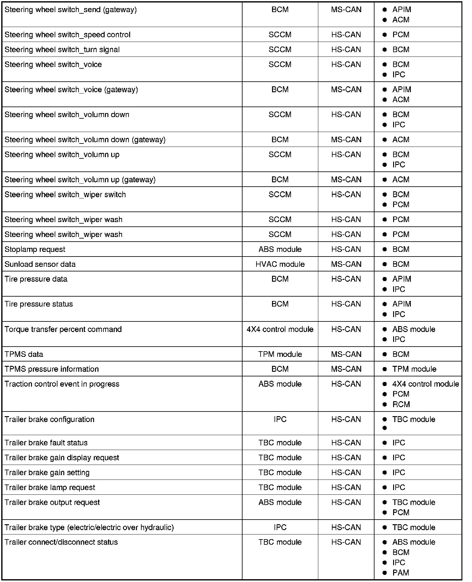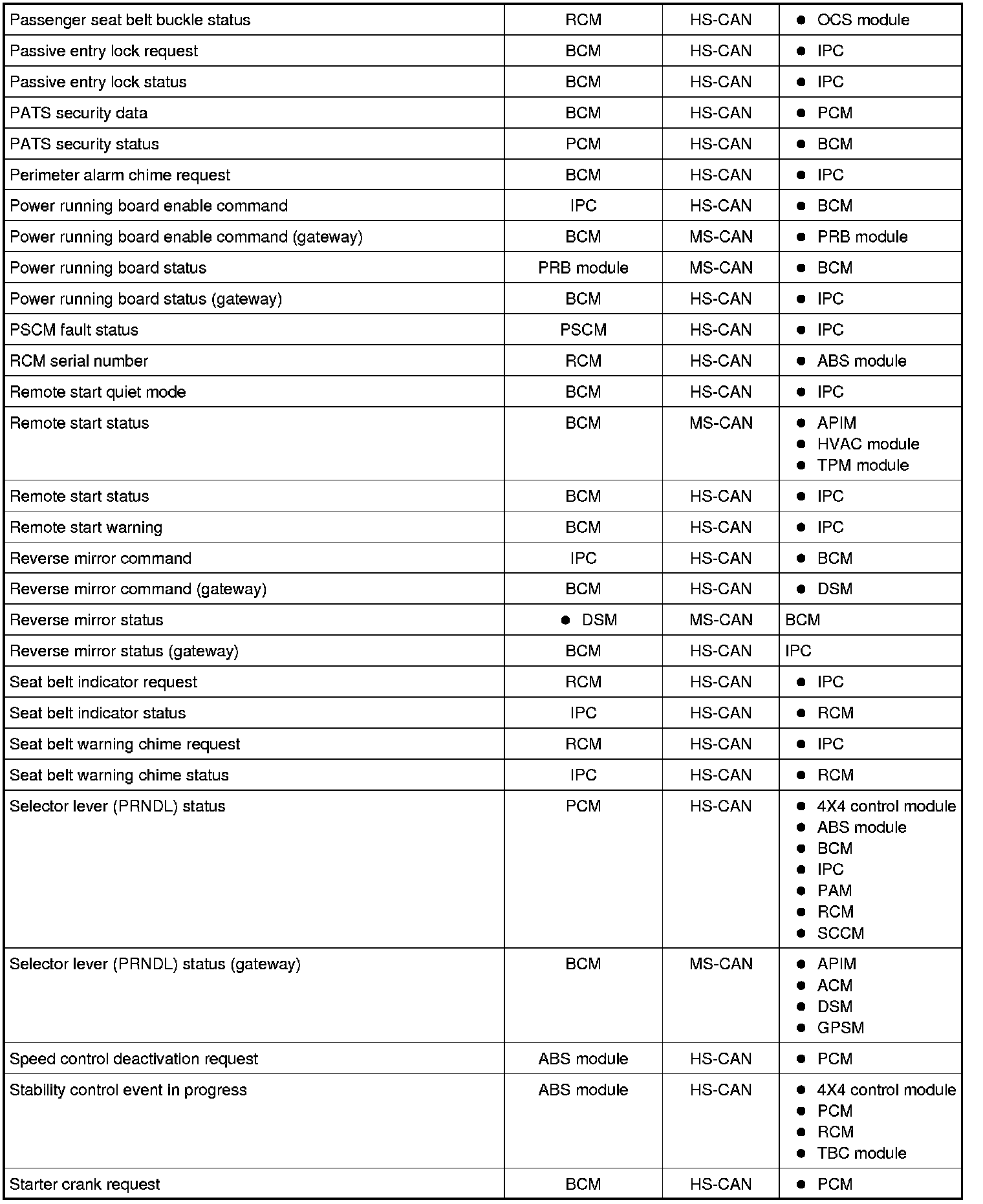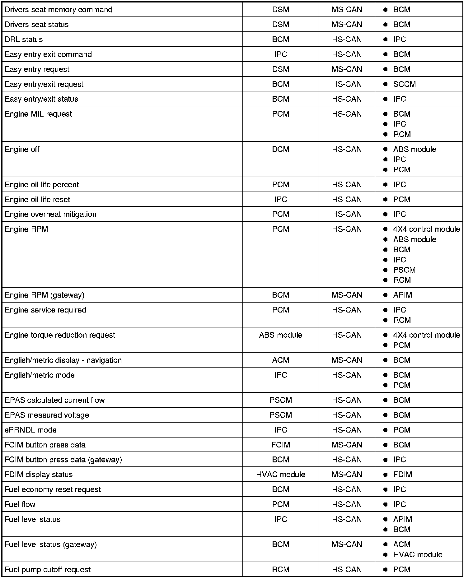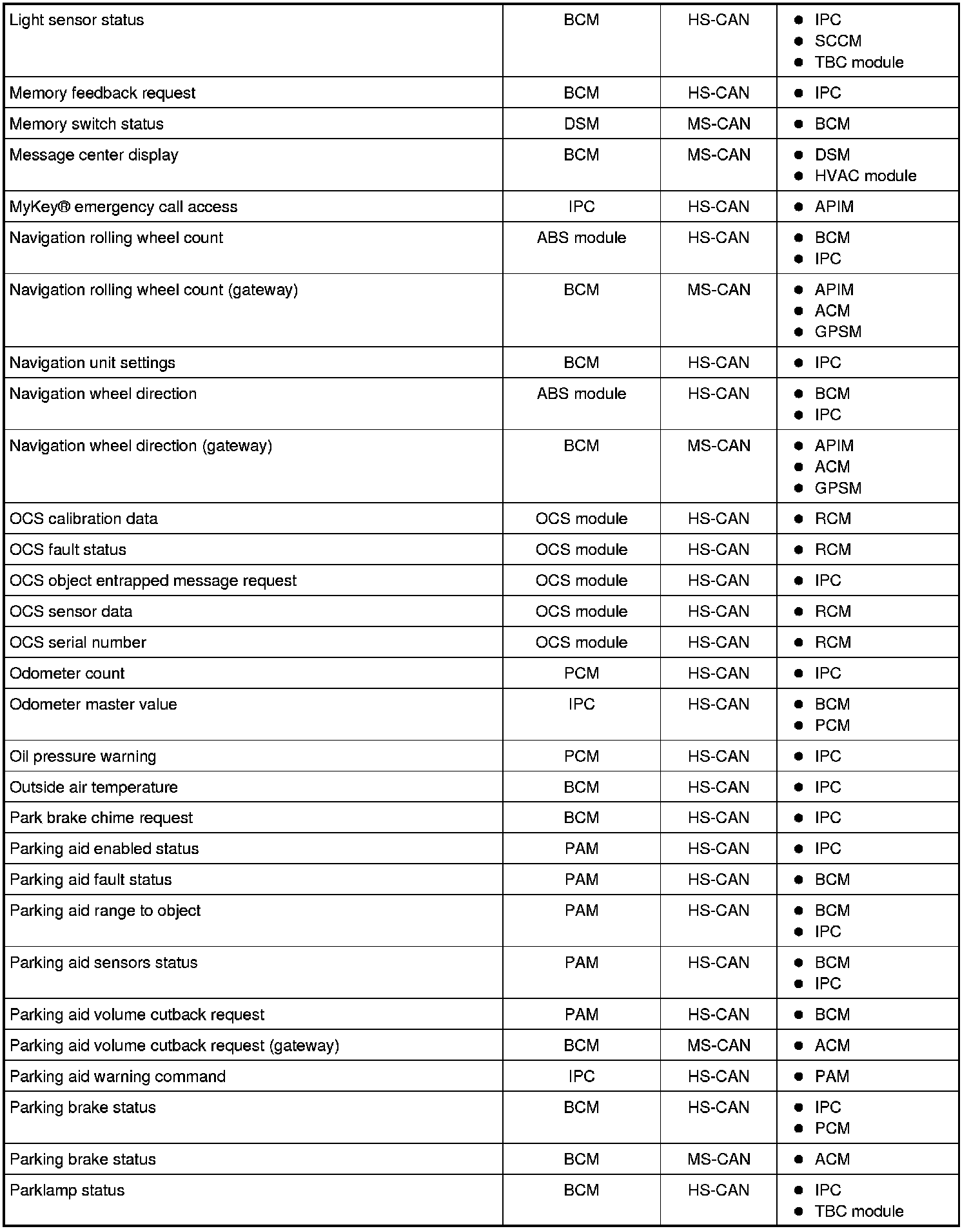 NOTE: This chart describes the specific HS-CAN and MS-CAN messages broadcast by each module, and the module(s) that receive the message.