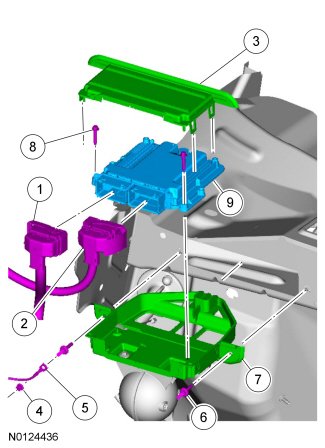 5. If the PCM support bracket is damaged, remove the nut and position the ground cable aside and remove the 2 PCM stud bolts and slide the PCM support bracket out of the bulkhead.