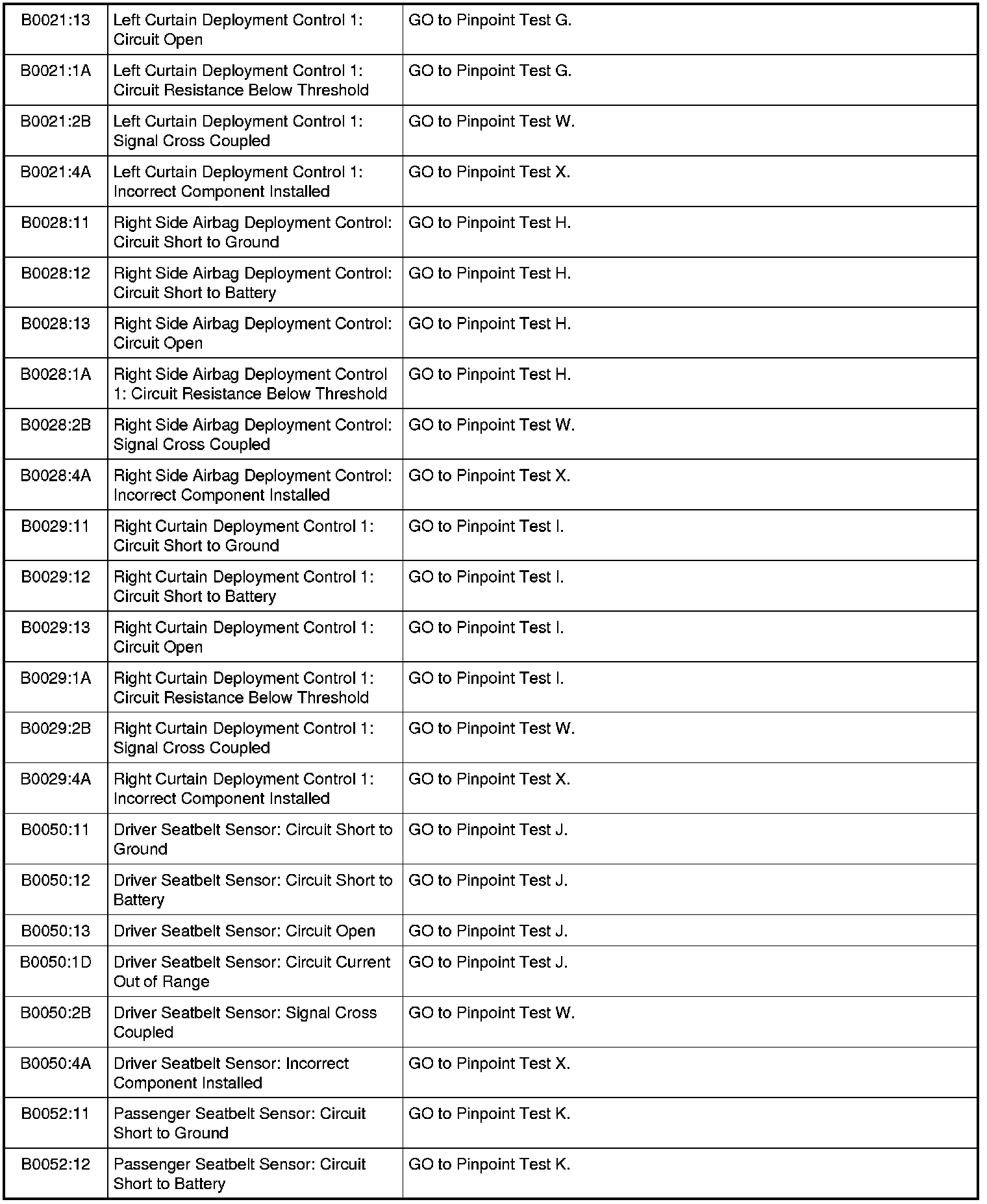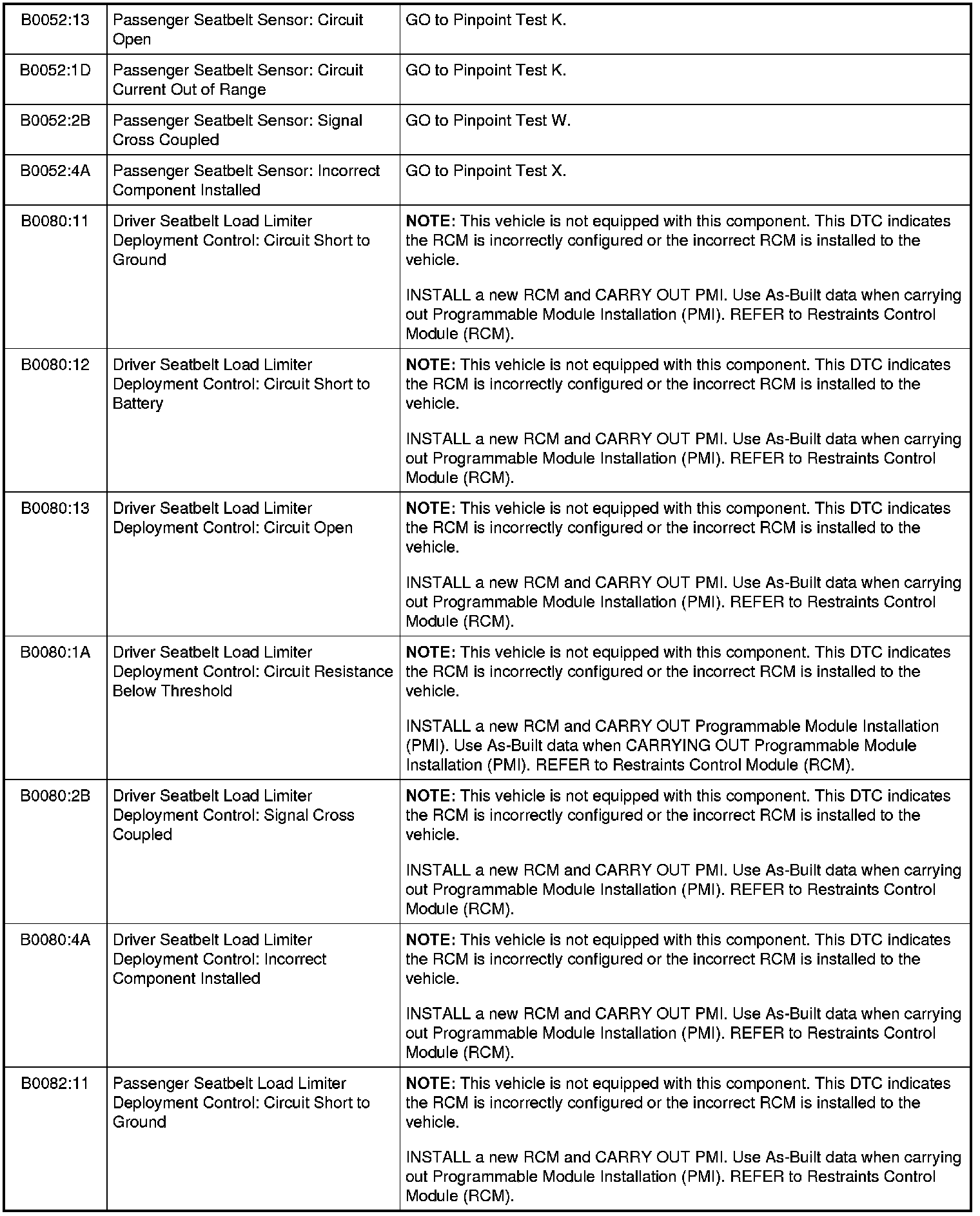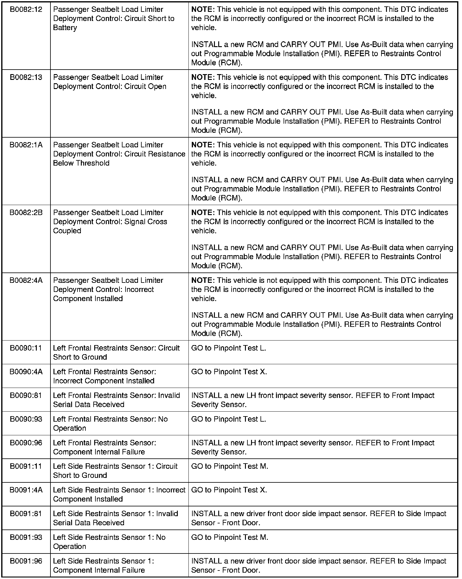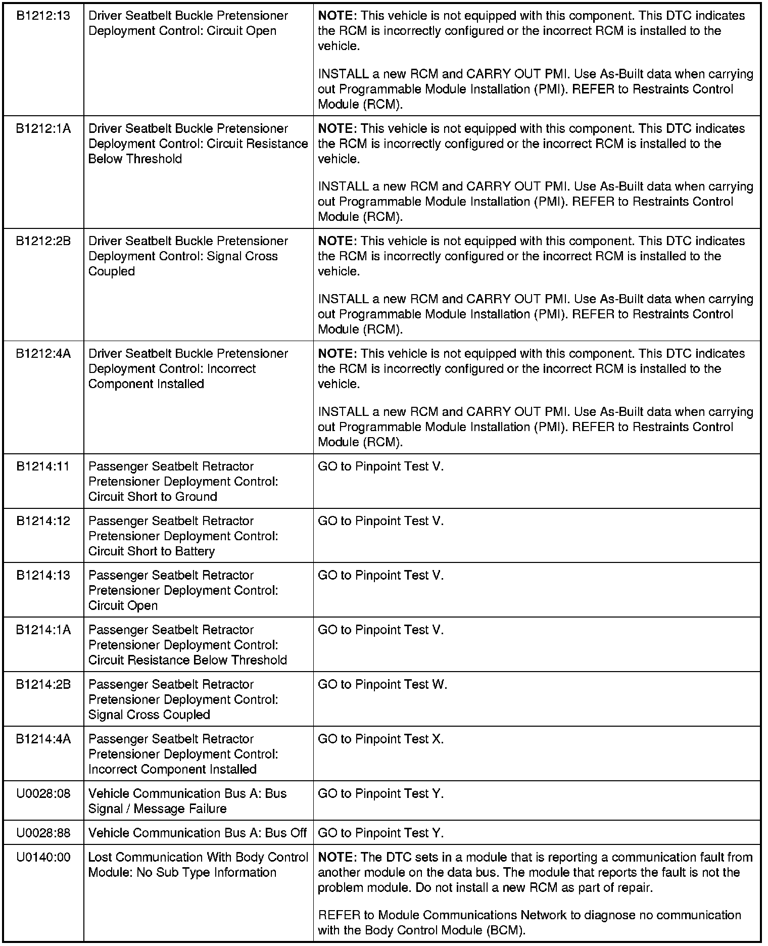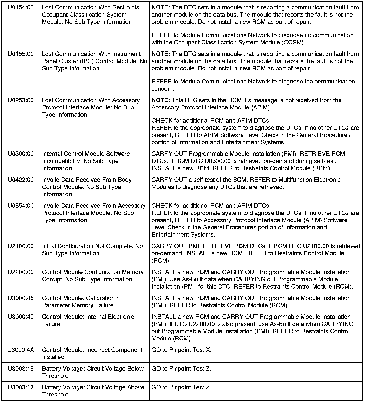 Restraints Control Module (RCM) DTC Chart