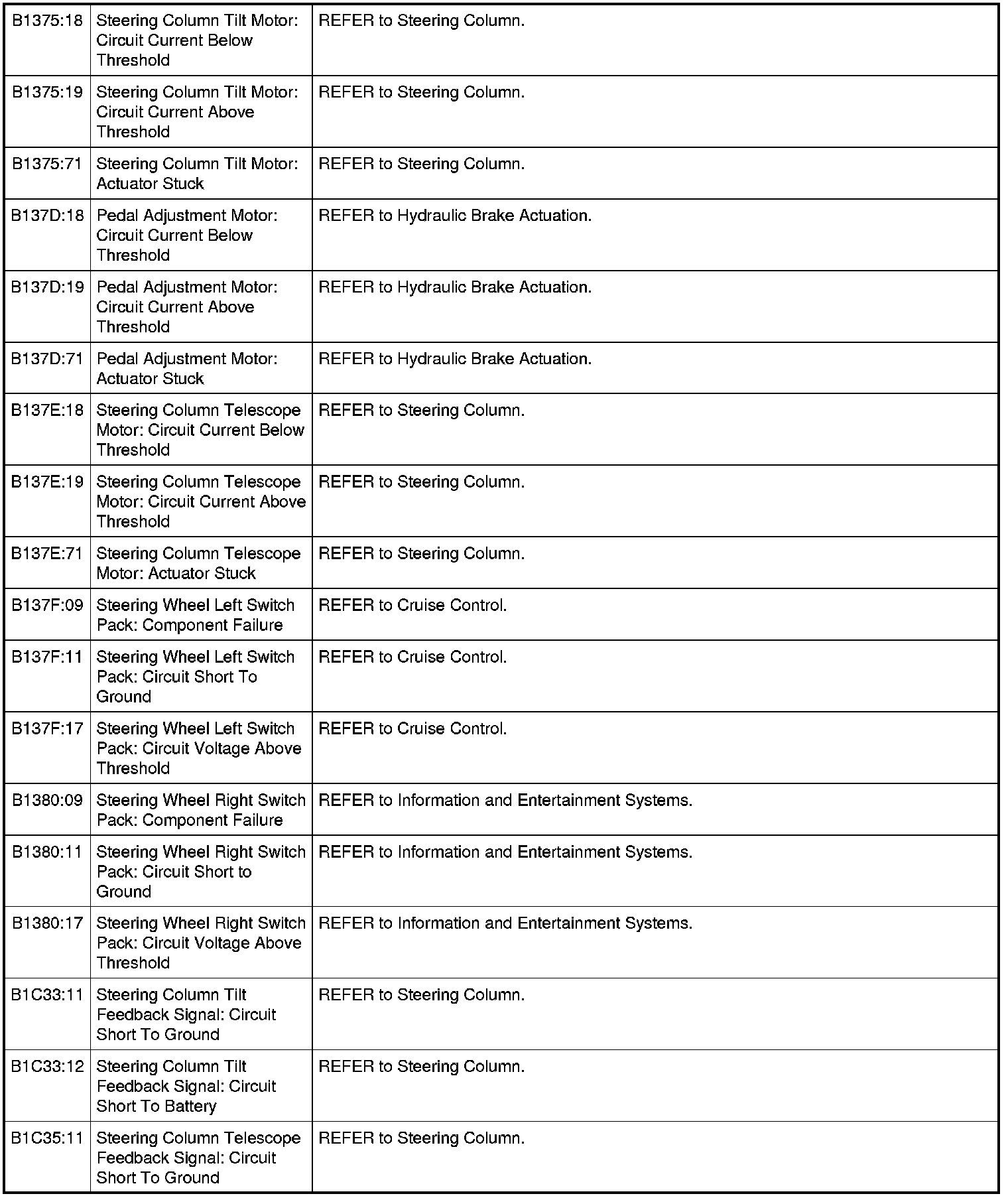 Steering Column Switches - DTC Chart
