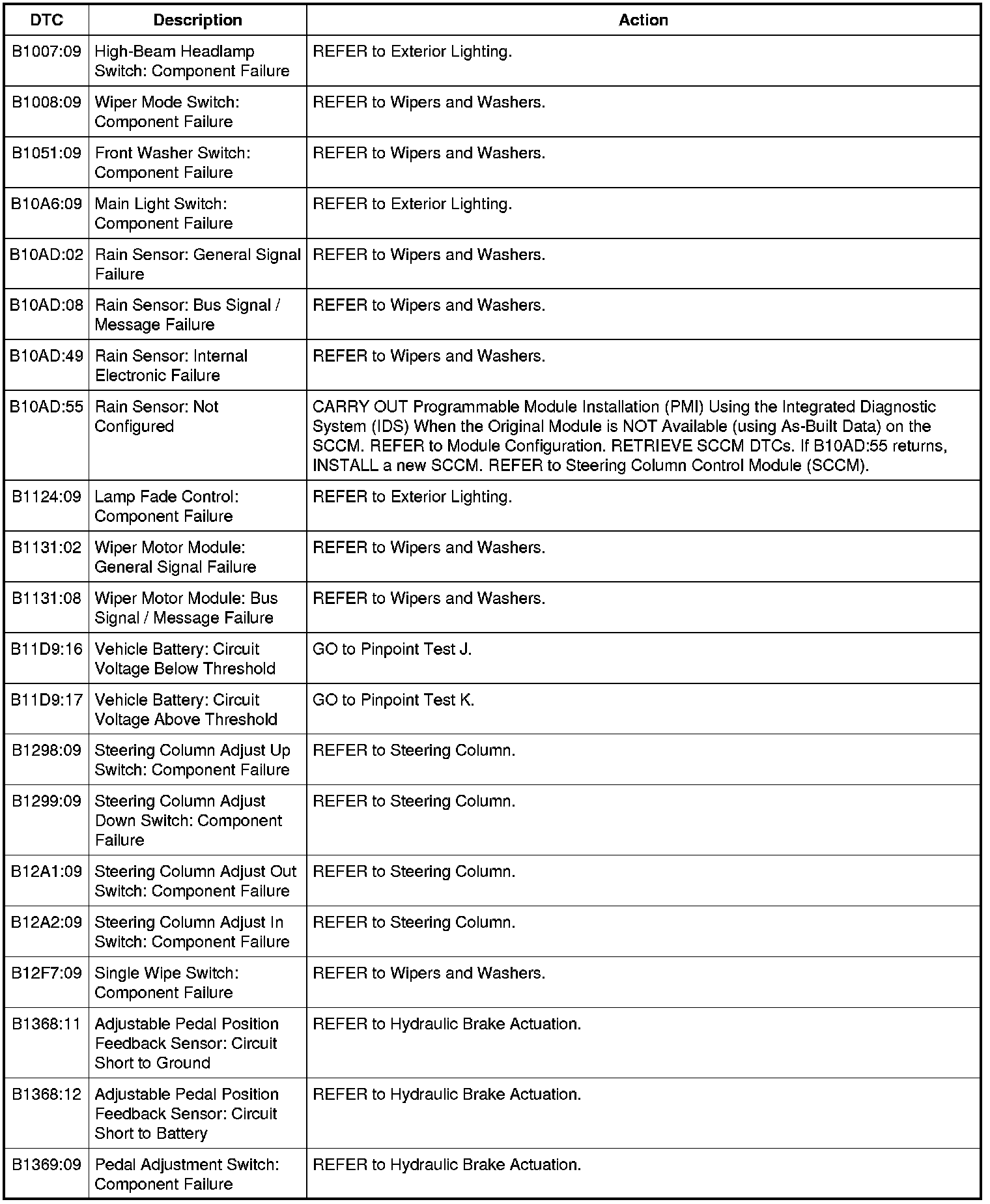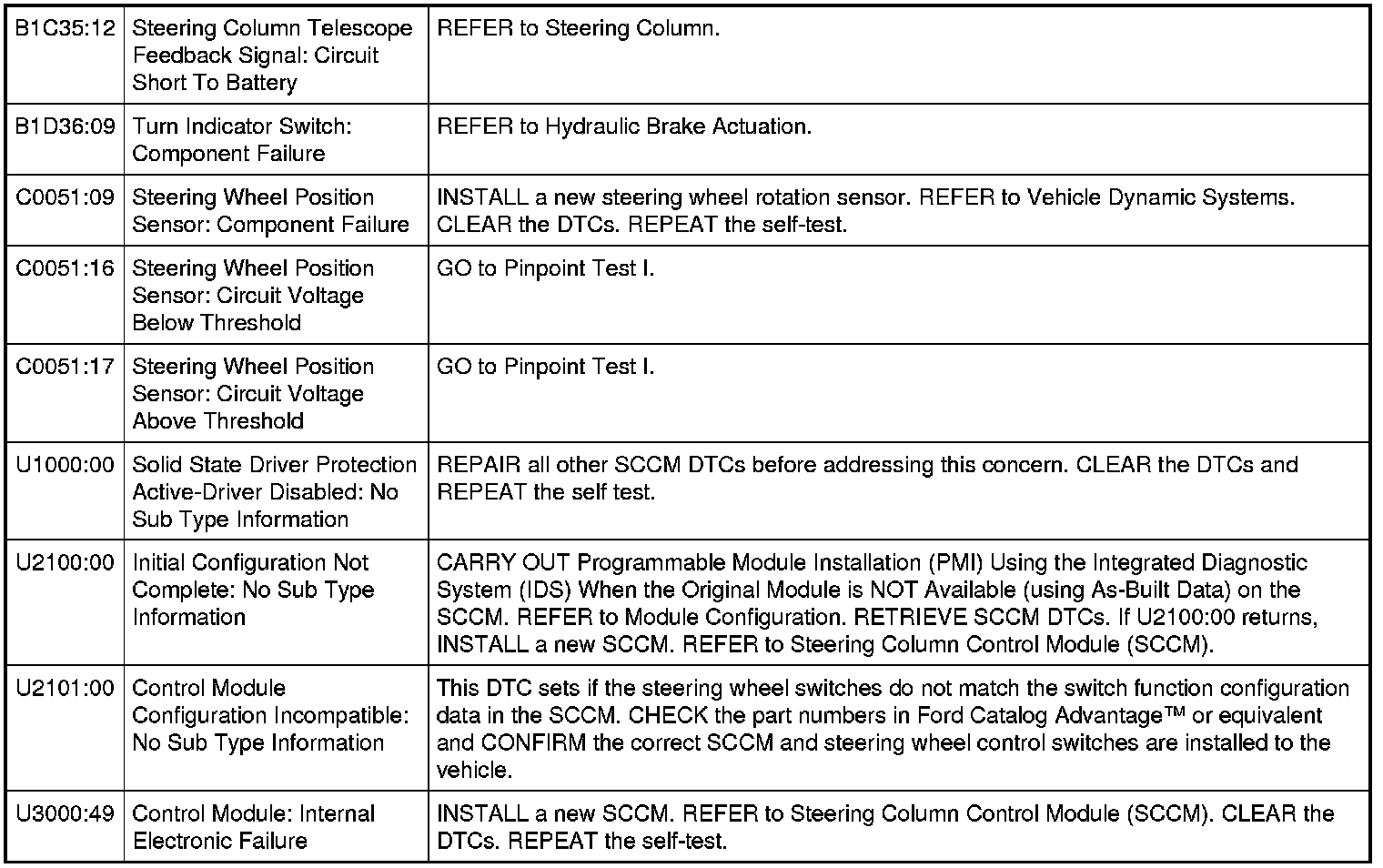 Steering Column Control Module (SCCM) DTC Chart