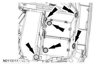 22. Disengage the 5 pin-type retainers from the RH battery tray and disconnect.