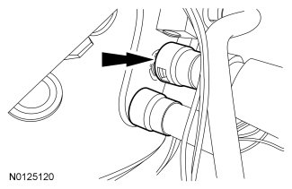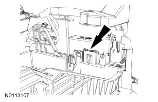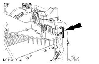 19. Disengage the pin-type retainer from the RH battery tray and position the battery cables aside.