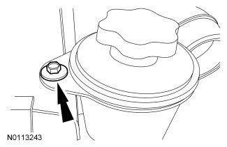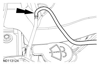 14. Disengage the retaining clip, then disconnect the fill hose from the degas bottle and remove the LH battery tray.