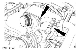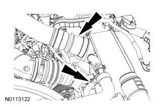 38. Disconnect the turbocharger air inlet hose and the Charge Air Cooler (CAC) outlet hose at the T-fitting.