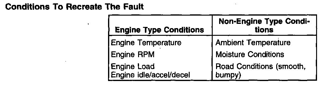 Recreating the fault is the first step in isolating the cause of the intermittent symptom. If freeze frame data is available, it may help in recreating the conditions at the time of a malfunction indicator lamp (MIL) diagnostic trouble code (DTC). Listed below are some of the conditions for recreating the fault.