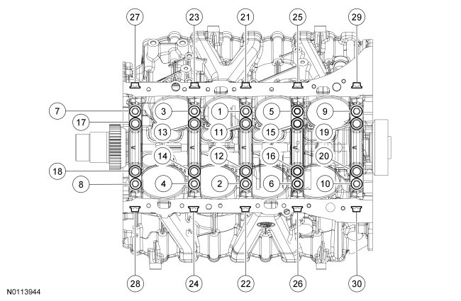 Loosely install the 20 crankshaft main bearing cap bolts and 10 crankshaft main bearing cap side bolts. Tighten the crankshaft main bearing cap bolts in 7 stages, in the sequence shown: