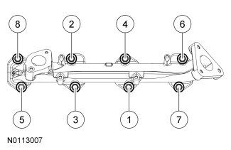 Using a new gasket, install the LH exhaust manifold, 8 spacers and 8 new nuts. Tighten the nuts in 3 stages, in the sequence shown.