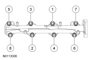 Using a new gasket, install the RH exhaust manifold, 8 spacers and 8 new nuts. Tighten the nuts in 3 stages, in the sequence shown.