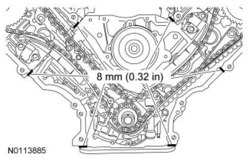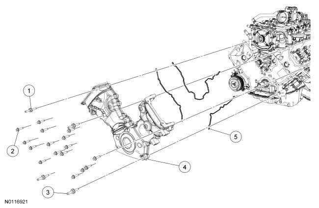 NOTE: If the engine front cover is not secured within 6 minutes, the sealant must be removed and the sealing area cleaned. To clean the sealing area, use silicone gasket remover and metal surface prep. Allow to dry until there is no sign of wetness, or 5 minutes, whichever is longer. Follow the directions on the packaging. Failure to follow this procedure can cause future oil leakage.