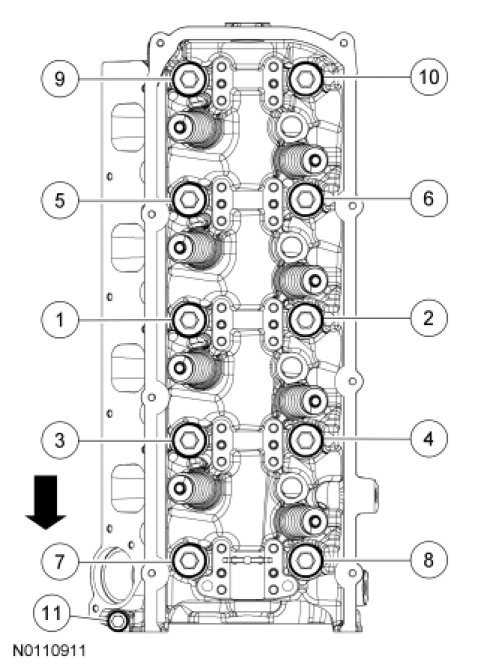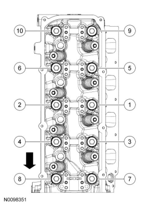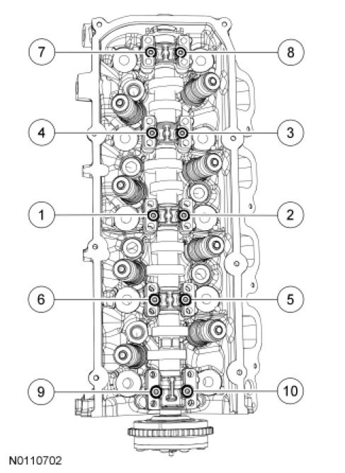 Position the 5 camshaft bearing caps in their original locations and install the 10 bolts in the sequence shown, in 2 stages.
