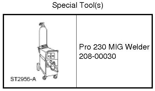 31. Make sure that the frame and service replacement part have attained a minimum room temperature of 10°C (50°F) before beginning the weld procedure. A Metal Inert Gas (MIG) welder capable of producing 185-250 amps must be used. Use 0.9 mm (0.035 in) - 1.1 mm (0.043 in) ER70S-3 or equivalent weld wire that is compatible with SAE 1010 steel. Shielding gas must be 100% carbon dioxide, or 75% carbon dioxide and 25% argon.