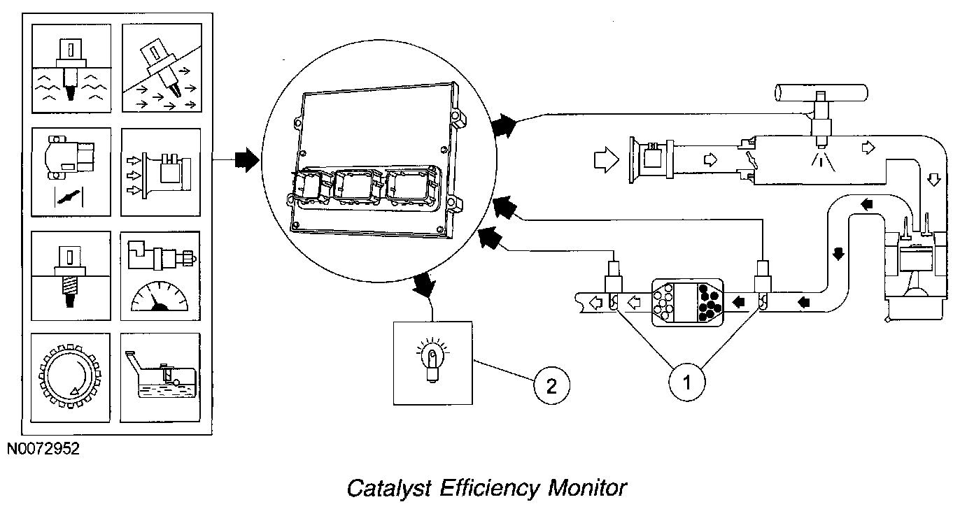Inputs from engine coolant temperature (ECT) or cylinder head temperature (CHT), intake air temperature (IAT), mass airflow (MAF), crankshaft position (CKP), throttle position (TP), and vehicle speed sensors are required to enable the catalyst efficiency monitor.