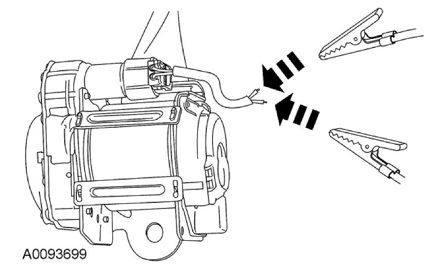 9. Deploy the safety belt buckle or retractor by touching the ends of the 2 wires of the jumper harness to the terminals of a 12-volt battery.