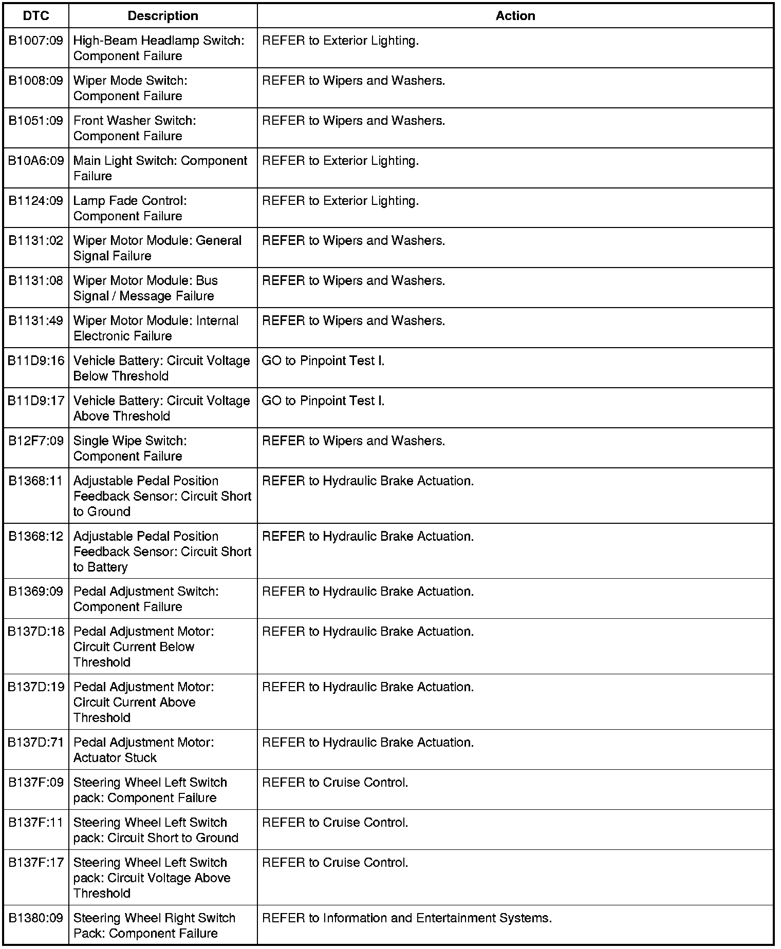 Steering Column Control Module (SCCM) DTC Chart