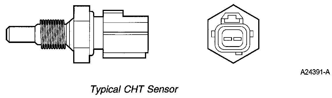 The CHT sensor is a thermistor device in which resistance changes with the temperature. The electrical resistance of a thermistor decreases as temperature increases, and the resistance increases as the temperature decreases. The varying resistance affects the voltage drop across the sensor terminals and provides electrical signals to the PCM corresponding to temperature.