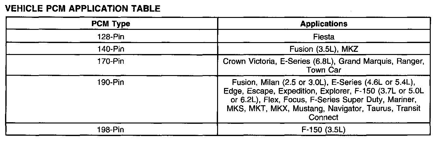 The center of the engine control (EC) system is a microprocessor called the PCM. The PCM receives input from sensors and other electronic components (switches, relays). Based on the information received and programmed into its memory, the PCM generates output signals to control various relays, solenoids and actuators. There are several different types of PCMs in use for this model year. Refer to the Vehicle PCM Application Table below for PCM types and their applications.