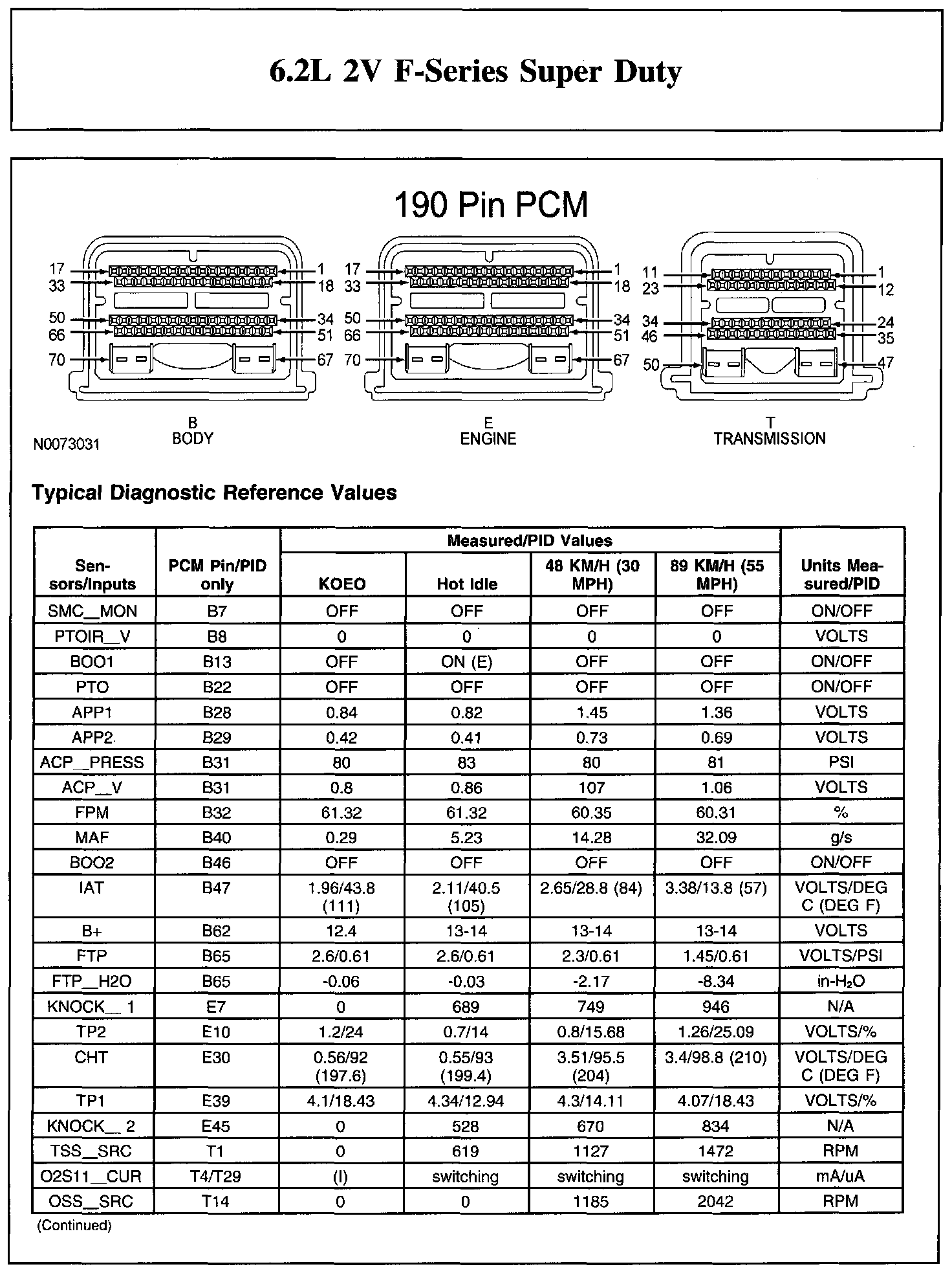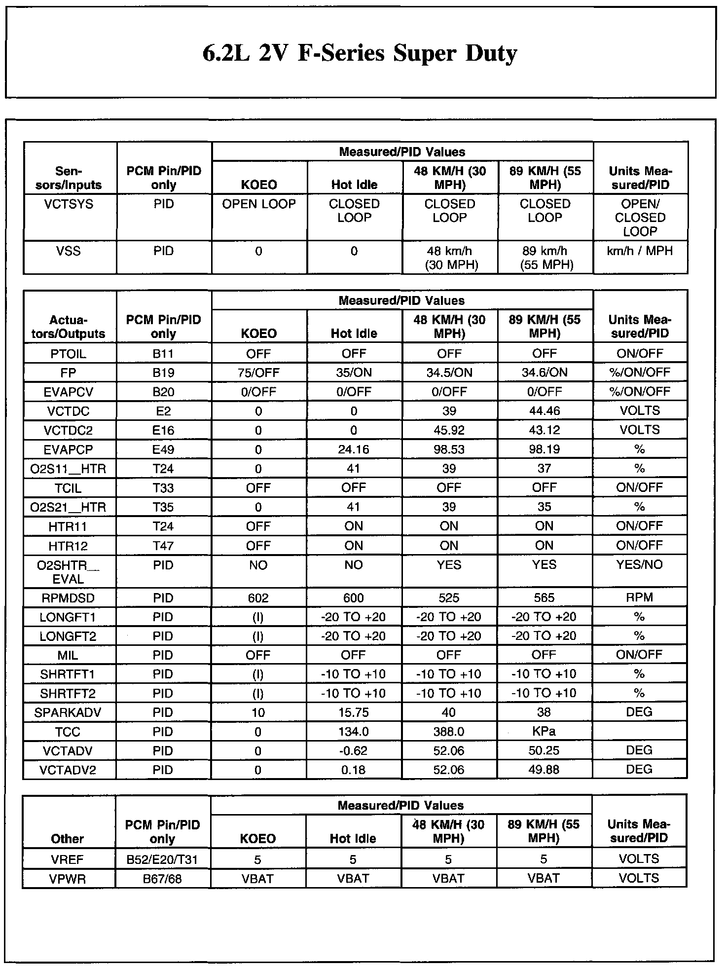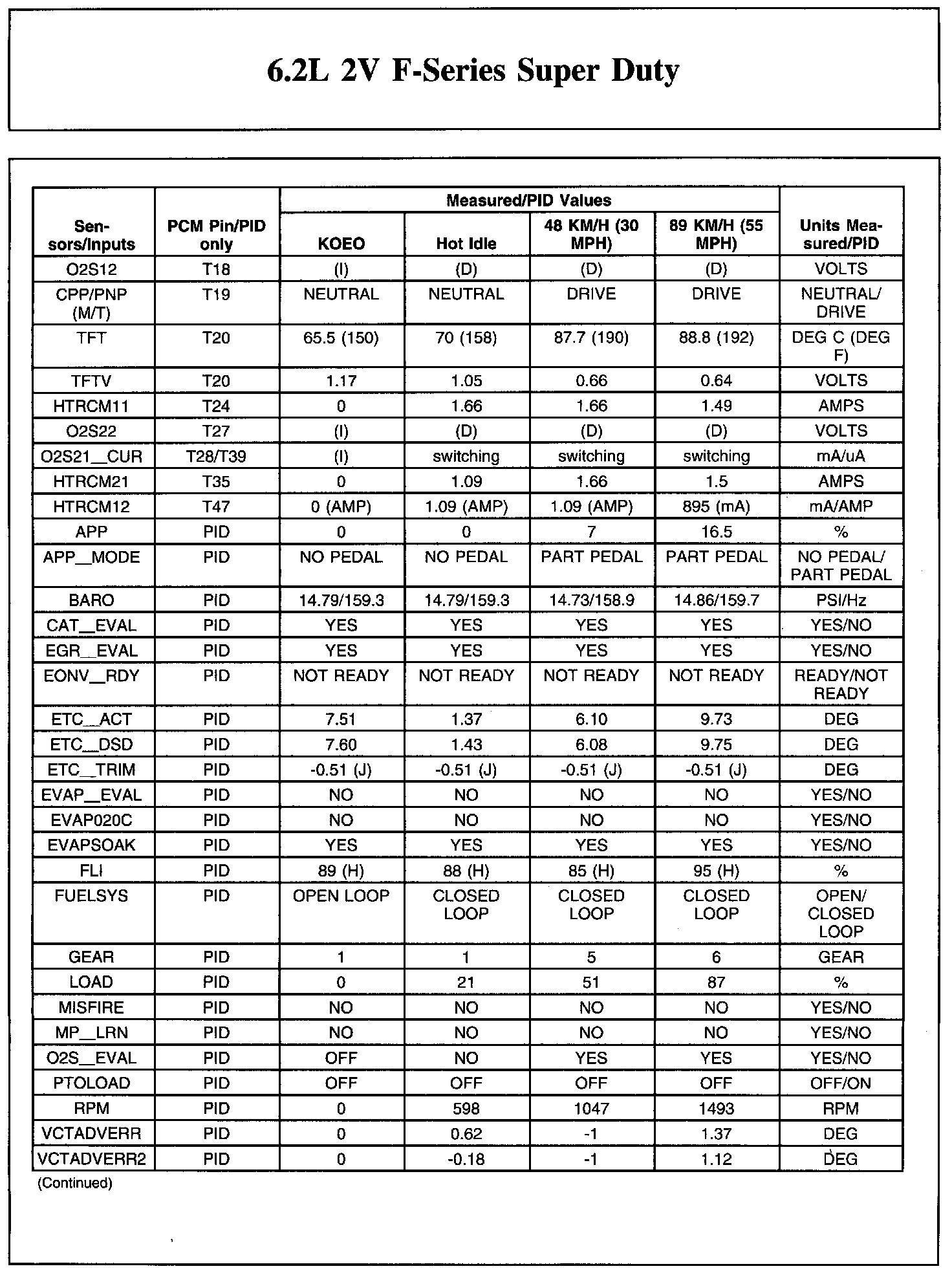 The Typical Diagnostic Reference Value Charts do not display fault parameter identifications (PIDs). These are PIDs which indicate a hard fault with the circuit. They display a value of YES or NO and are PIDs ending with the letter F.