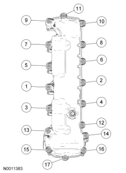 98. Position the LH valve cover and new gasket on the cylinder head and tighten the 17 fasteners in the sequence shown.