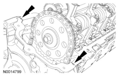 51. NOTE: The LH timing chain tensioner arm has a bump near the dowel hole for identification.