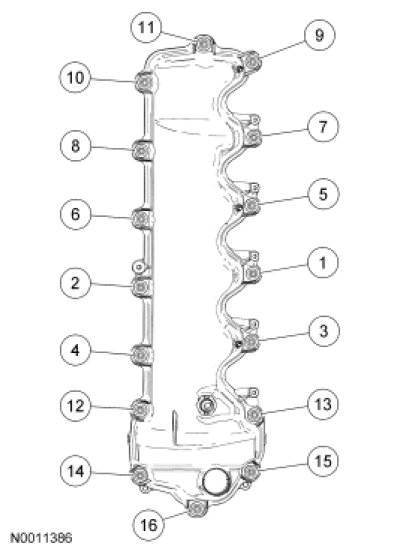 95. Position the RH valve cover and new gasket on the cylinder head and tighten the 16 fasteners in the sequence shown.