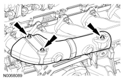 88. Position the exhaust manifold heat shield and install the 3 bolts.