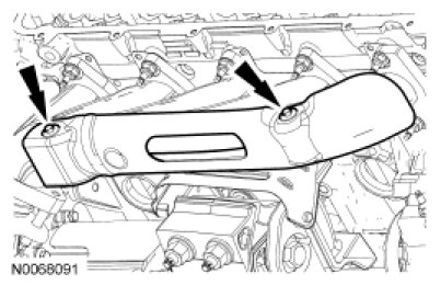91. Position the exhaust manifold heat shield and install the 2 bolts.