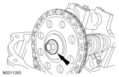 3. NOTICE: Only use hand tools to loosen the sprocket bolt or damage to the camshaft or camshaft sprocket may occur.
