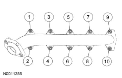 Install 10 new exhaust manifold nuts in the sequence shown.