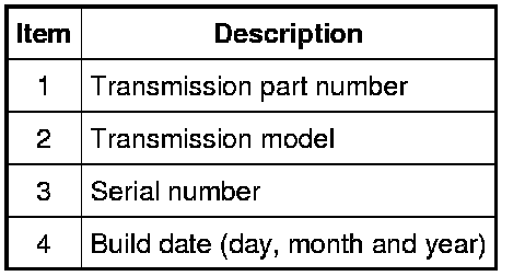 All transmissions come equipped with an identification tag located on the left side of the transmission, rearward of the manual control lever. For transmission model number, transmission part number, serial number and build date, refer to the transmission identification tag located on the transmission case.