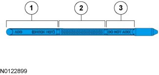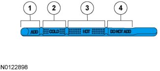 6. Using the scan tool with the engine running, check and make sure the transmission is at normal operating temperature 82-93°C (180-200°F). Check and adjust the transmission fluid level and check for any leaks. If transmission fluid is needed, add transmission fluid in increments of 0.24L (0.5 pt) until the correct level is achieved.