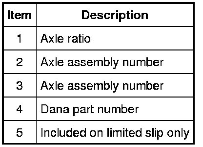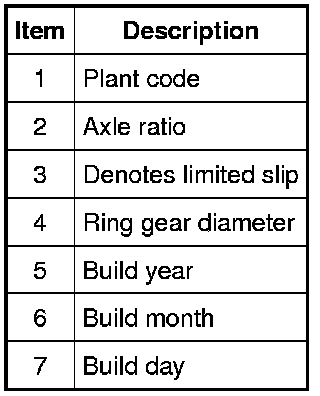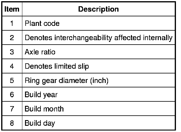 The axle identification tag identifies a particular axle design, a specific ratio and if it is a conventional or limited slip type. In addition, the plant code will not change as long as that particular axle assembly never undergoes an external design change. If, however, an internal design change takes place during the production life of the axle and that internal change affects parts interchangeability, a dash and numerical suffix is added to the plant code. This means that as an assembly both axles are interchangeable; however, internally they are different. Therefore, each requires different internal parts at the time of repair.