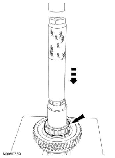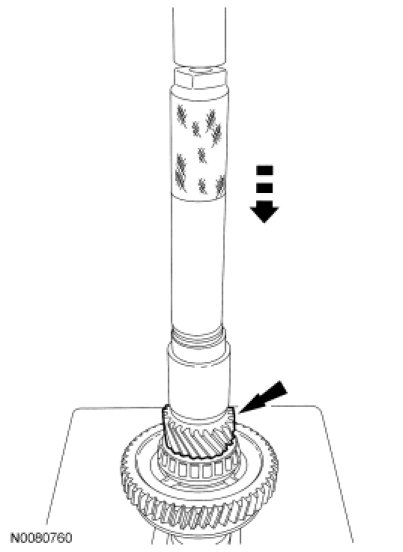 8. NOTICE: Drive the output shaft rear bearing onto the mainshaft by the inner race only. Using the outer race will damage the bearing. Press the bearing down until it is seated against the stop.