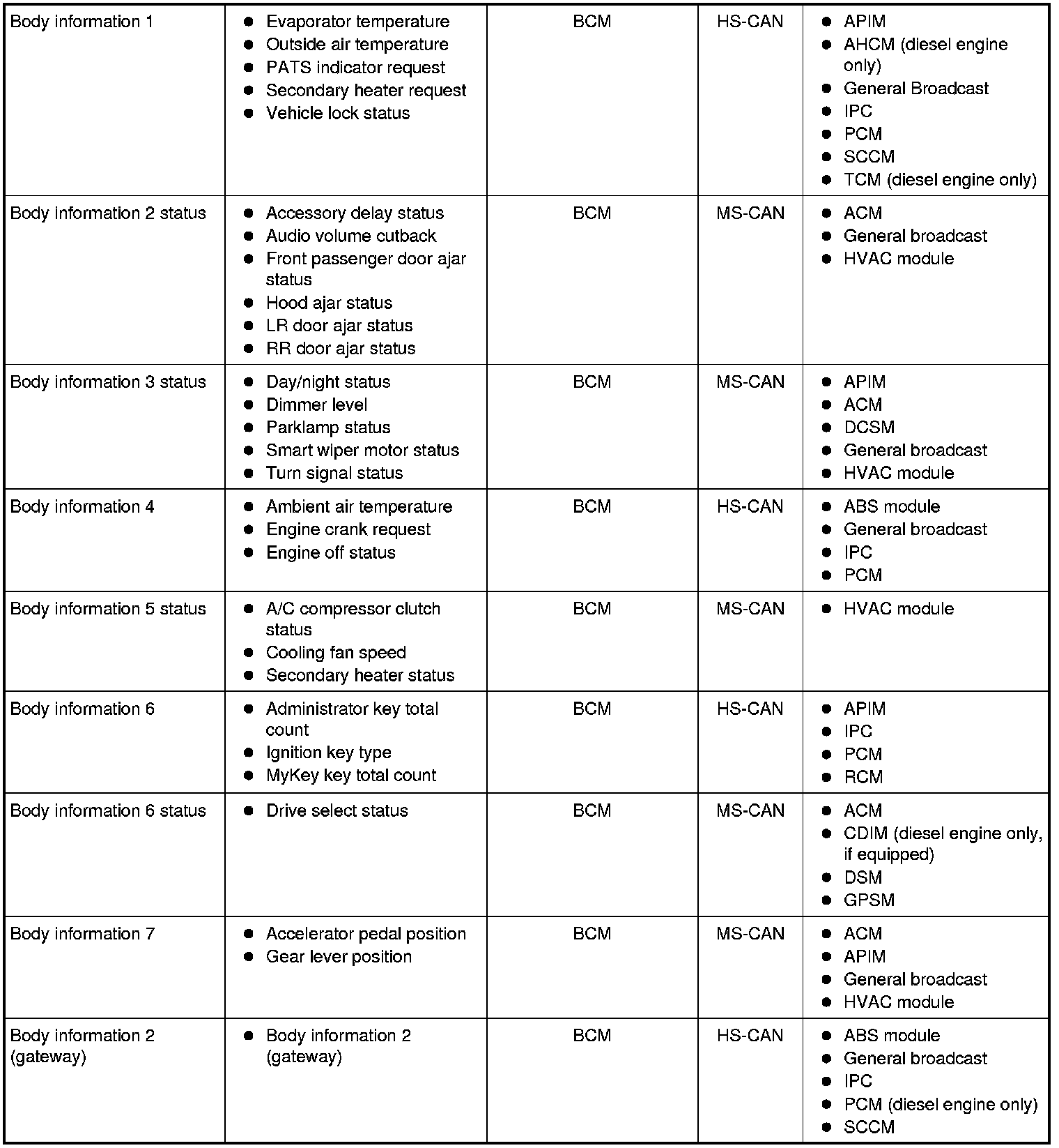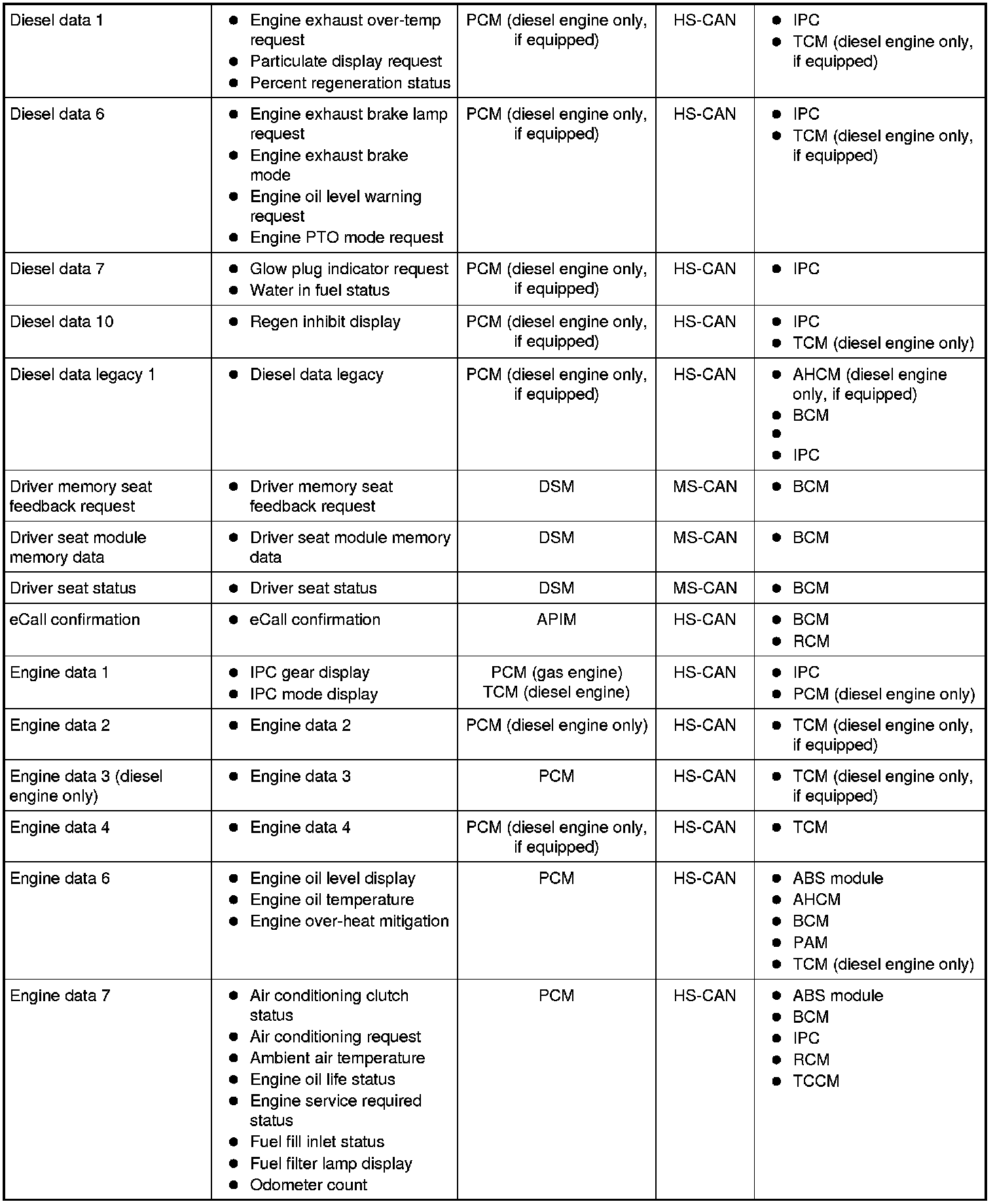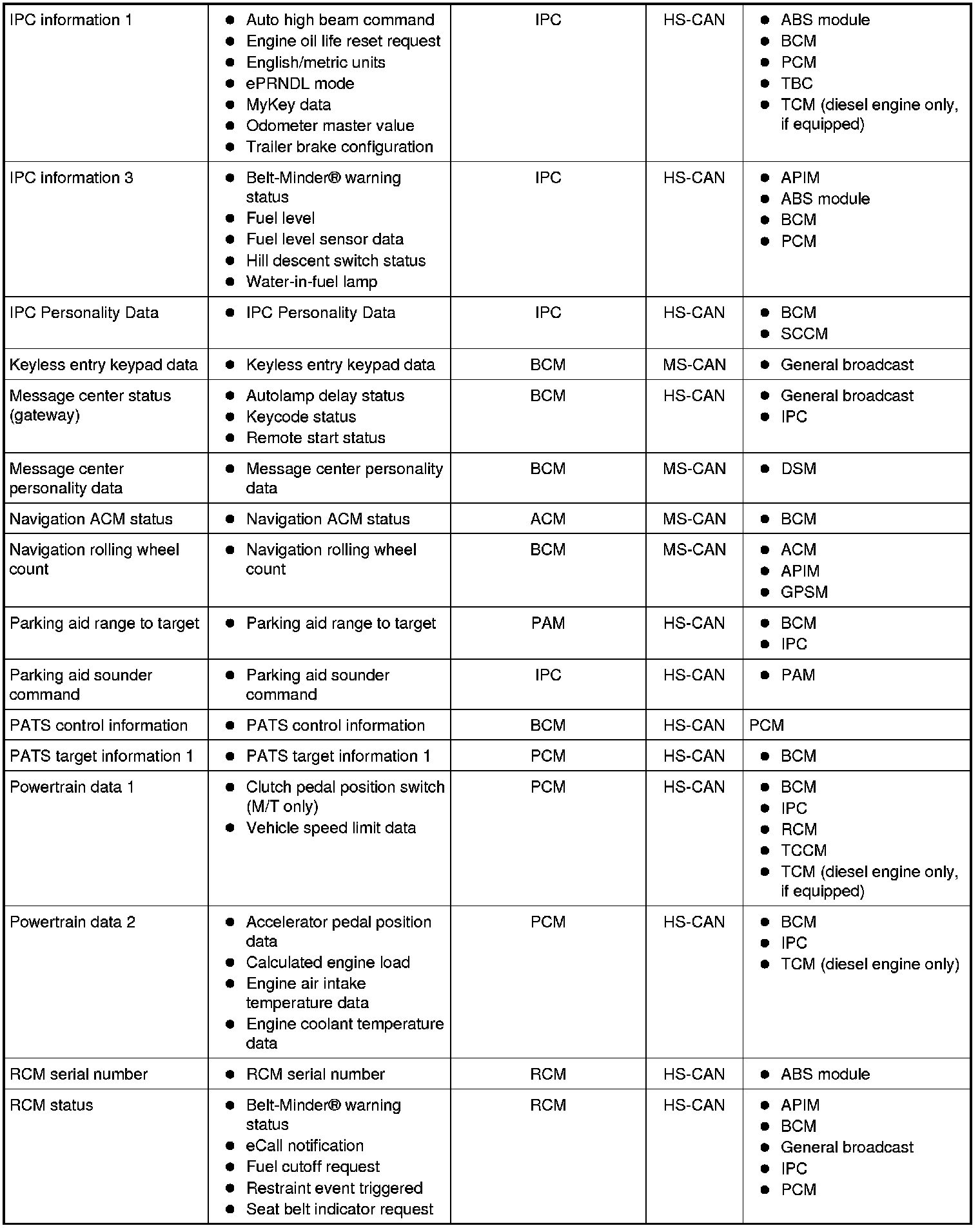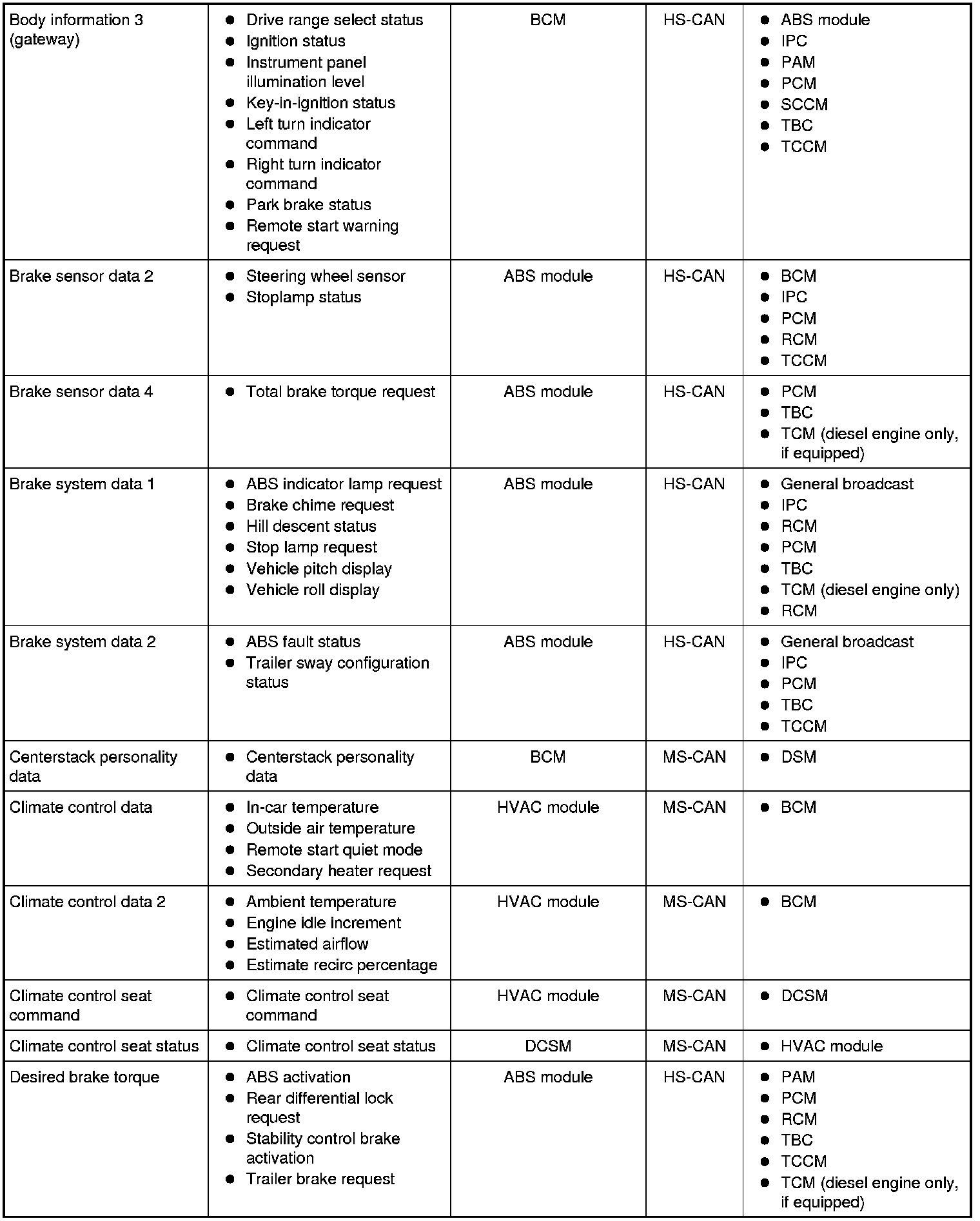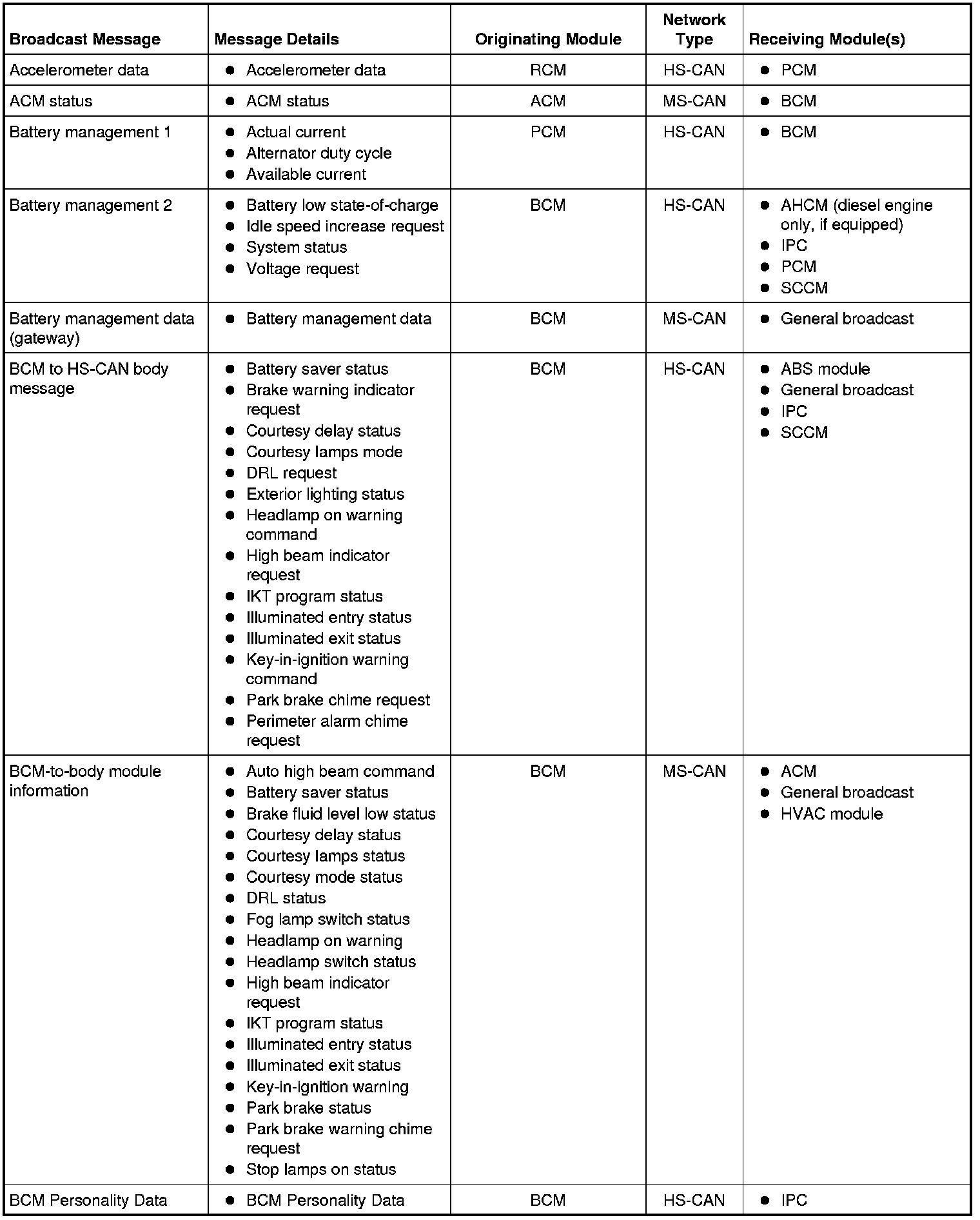 Modules on the CAN utilize simultaneous communication of 2 or more messages on the same network circuits. The following chart summarizes the messages sent and received on the network.