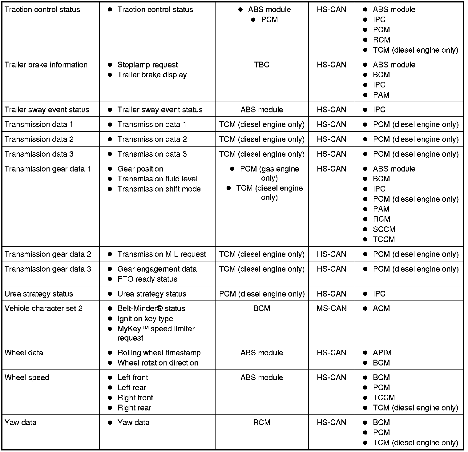 The HS-CAN communicates using bussed messages. The HS-CAN uses an unshielded twisted pair cable, data bus (+) and data bus (-) circuits. In addition to scan tool communication, this network allows sharing of information between all modules on the network.
