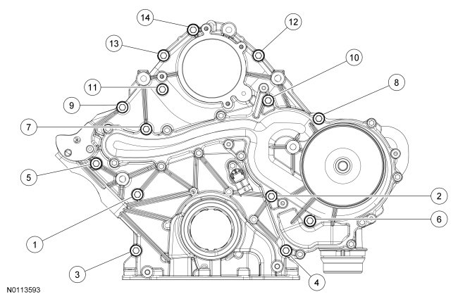 Using a new gasket, install the engine rear cover and the 10 bolts. Tighten in the 2 stages, in the sequence shown.