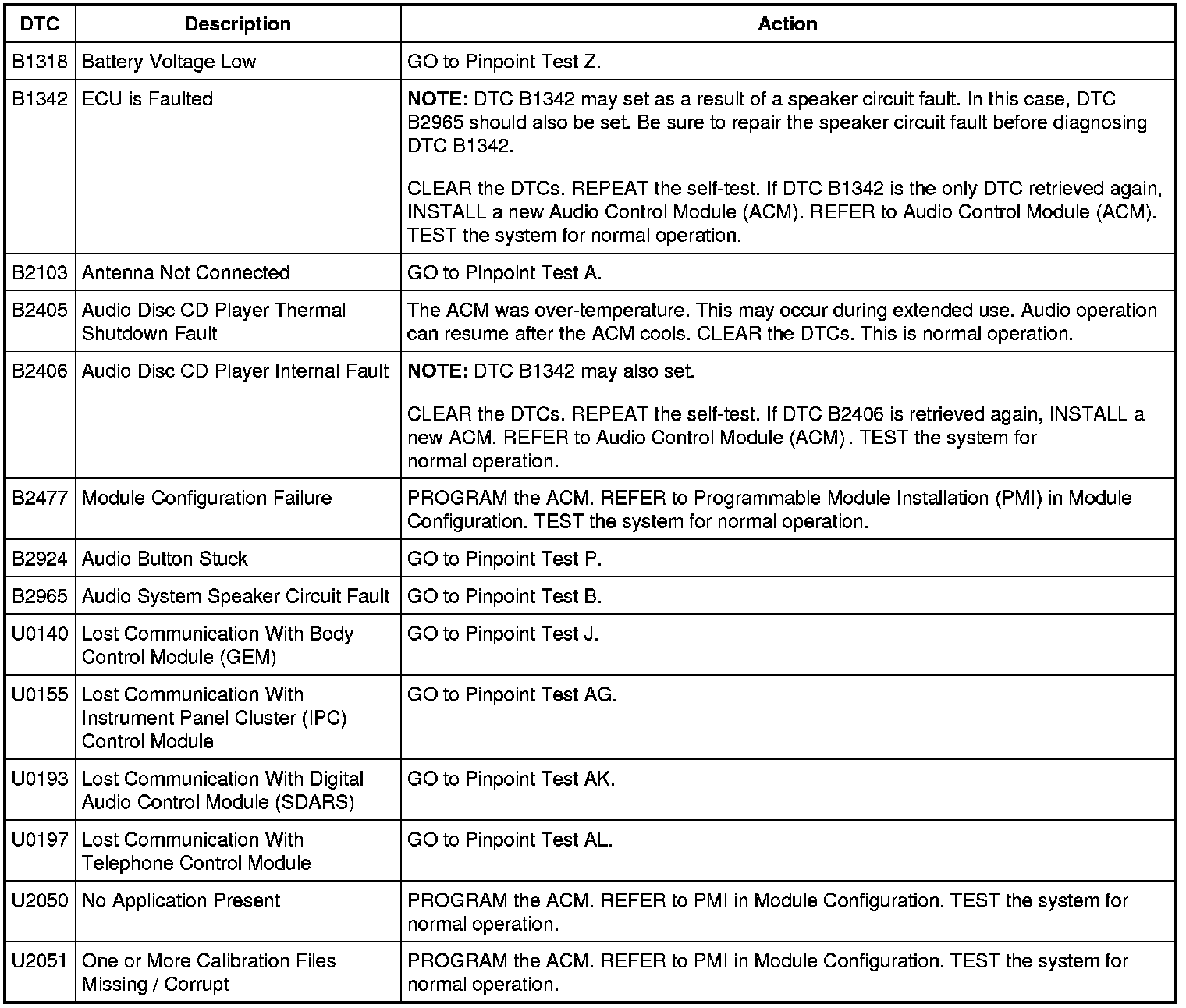 Audio Control Module (ACM) - Without Navigation (Early Build) DTC Chart