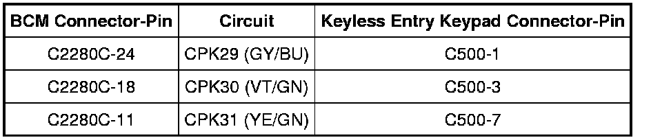 The Body Control Module (BCM) monitors for a ground signal on the keyless entry keypad signal input circuits. When an individual keypad button is pressed, an individual or combination of the input circuits is routed to ground. The BCM then determines which button was pressed based on which circuit(s) are grounded. The keypad has a dedicated ground circuit. Once the BCM determines that the 5-digit personal entry code, or the factory set 5-digit entry code has been entered on the keypad, the BCM then energizes the driver door unlock relay to unlock the driver door (stepped unlock enabled).