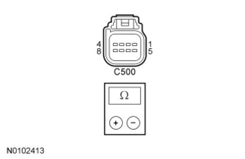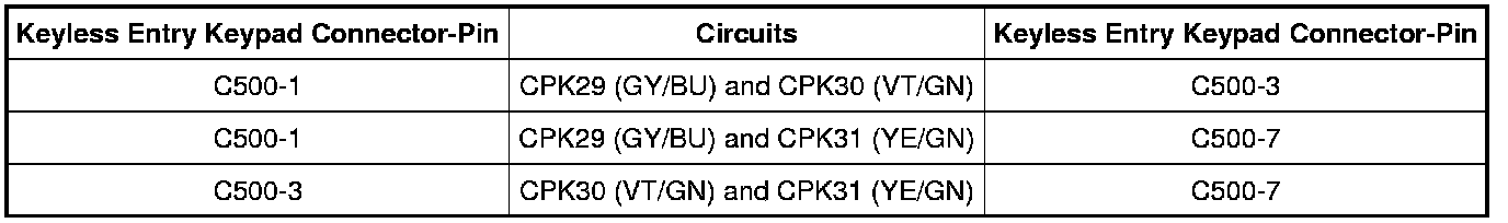- Measure the resistance between the keyless entry keypad C500-6, circuit GD133 (BK), harness side and ground.