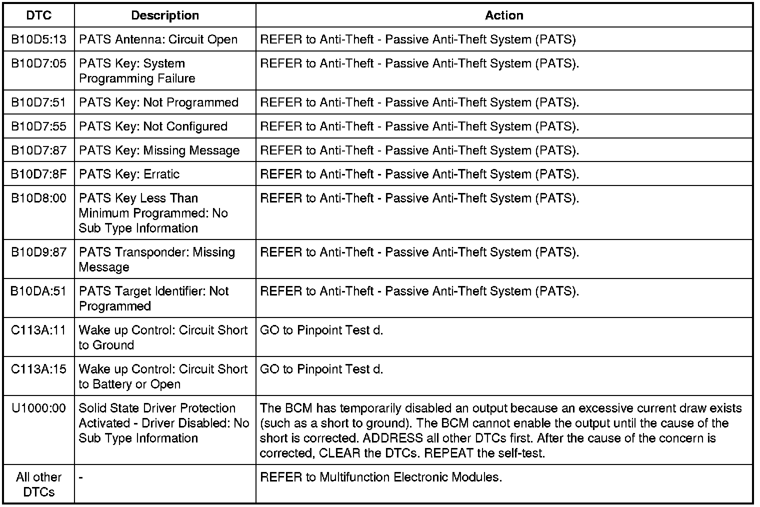 Body Control Module (BCM) DTC Chart